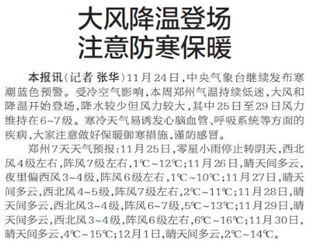 11月24日,中央气象台继续发布寒潮蓝色预警。受冷空气影响,本周郑州气温持续低迷,大风和降温开始登场,降水较少但风力较大,其中25日至29日风力维持在6~7级。寒冷天气易诱发心脑血管、呼吸系统等方面的疾病,大家注意做好保暖御寒措施,谨防感冒。(今日《郑州日报》1版)
