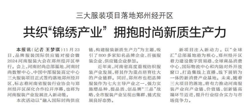 11月23日,品牌服装国际供应链对接会暨2024河南服装大会在郑州经开区举行。会上,河南时尚总部基地、河南时尚数智中心、中国中部服装高定中心三大服装项目正式签约落地郑州经开区,标志着河南省服装行业协会与郑州经开区深化合作拉开序幕,也将为河南服装产业发展注入新动能。(今日《郑州日报》1版)