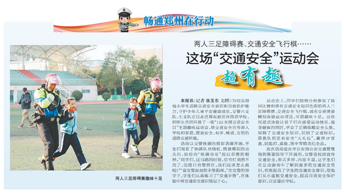 为切实增强小学生道路交通安全意识和自我防护能力,守护少年儿童平安健康成长,交警六支队、七支队近日走进郑东新区外国语学校,和师生共同开展了一场“122全国交通安全日”主题趣味运动会,将交通安全宣传深入学校和家庭,营造安全、有序、畅通、文明的道路交通环境。(今日《郑州日报》2版)