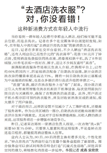 当你看到一群年轻人拉着行李箱出入酒店,他们极可能不是去住宿,而是去洗衣。记者在多个社交媒体平台浏览时发现,如今,在年轻人中流行起“去酒店开房洗衣服”的新消费方式。(今日《郑州日报》2版)