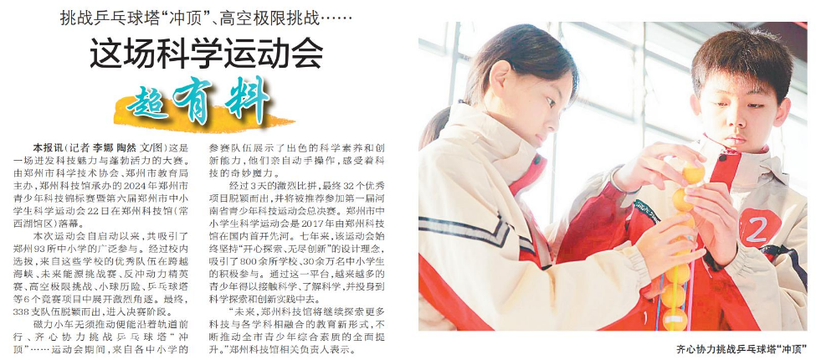 这是一场迸发科技魅力与蓬勃活力的大赛。由郑州市科学技术协会、郑州市教育局主办,郑州科技馆承办的2024年郑州市青少年科技锦标赛暨第六届郑州市中小学生科学运动会22日在郑州科技馆(常西湖馆区)落幕。(今日《郑州日报》2版)