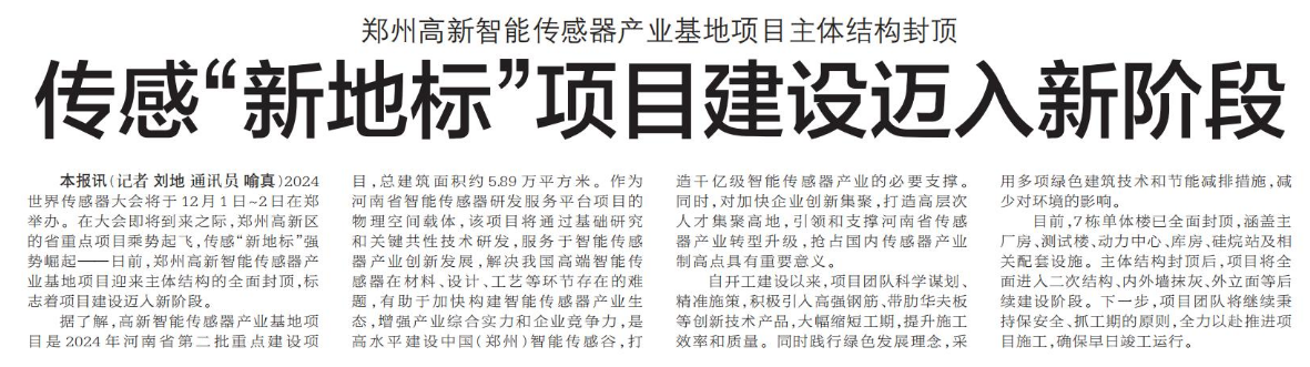 2024世界传感器大会将于12月1日~2日在郑举办。在大会即将到来之际,郑州高新区的省重点项目乘势起飞,传感“新地标”强势崛起——日前,郑州高新智能传感器产业基地项目迎来主体结构的全面封顶,标志着项目建设迈入新阶段。(今日《郑州日报》5版)