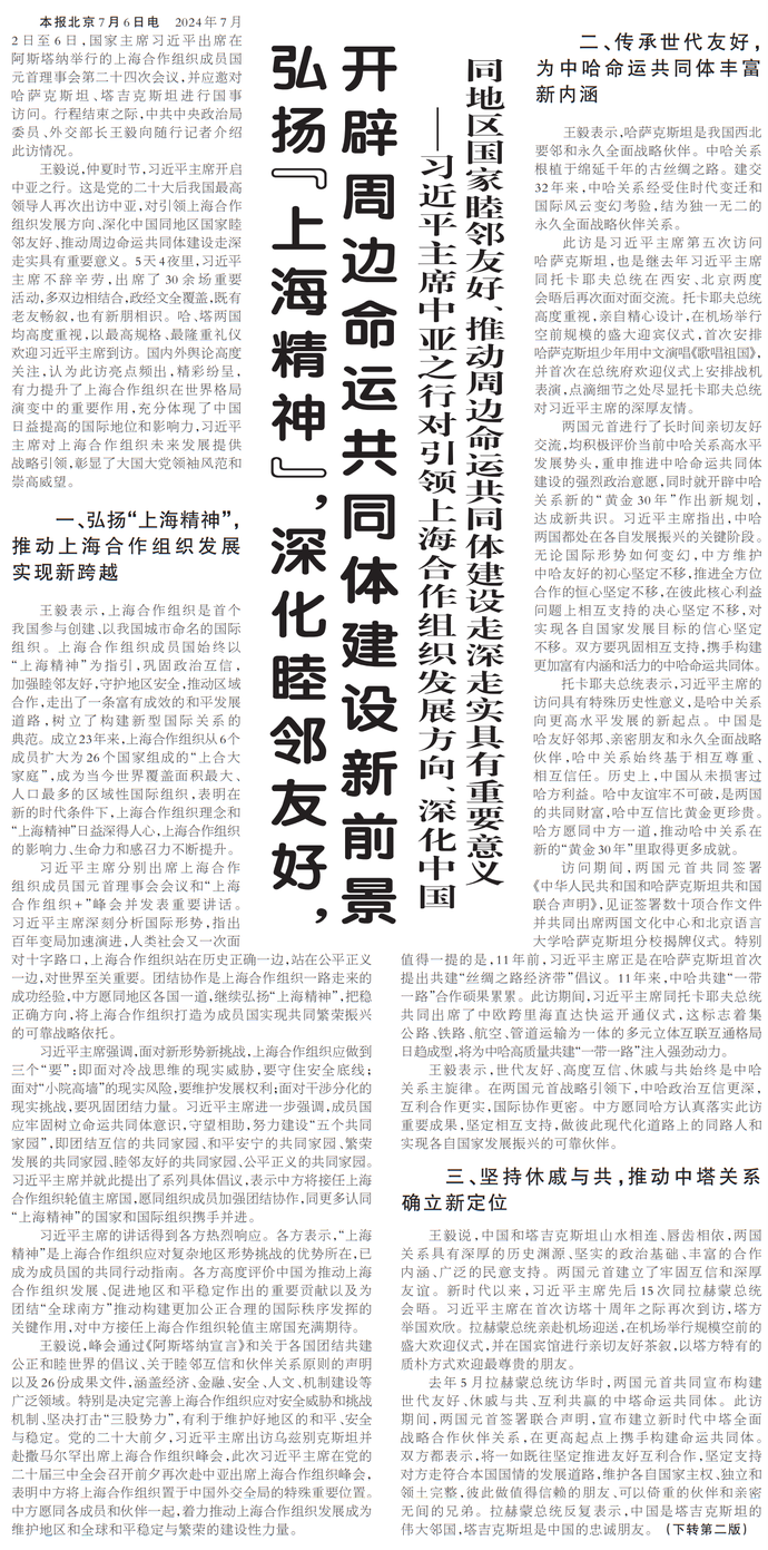 2024年7月2日至6日,国家主席习近平出席在阿斯塔纳举行的上海合作组织成员国元首理事会第二十四次会议,并应邀对哈萨克斯坦、塔吉克斯坦进行国事访问。行程结束之际,中共中央政治局委员、外交部长王毅向随行记者介绍此访情况。(今日《人民日报》1版、2版)