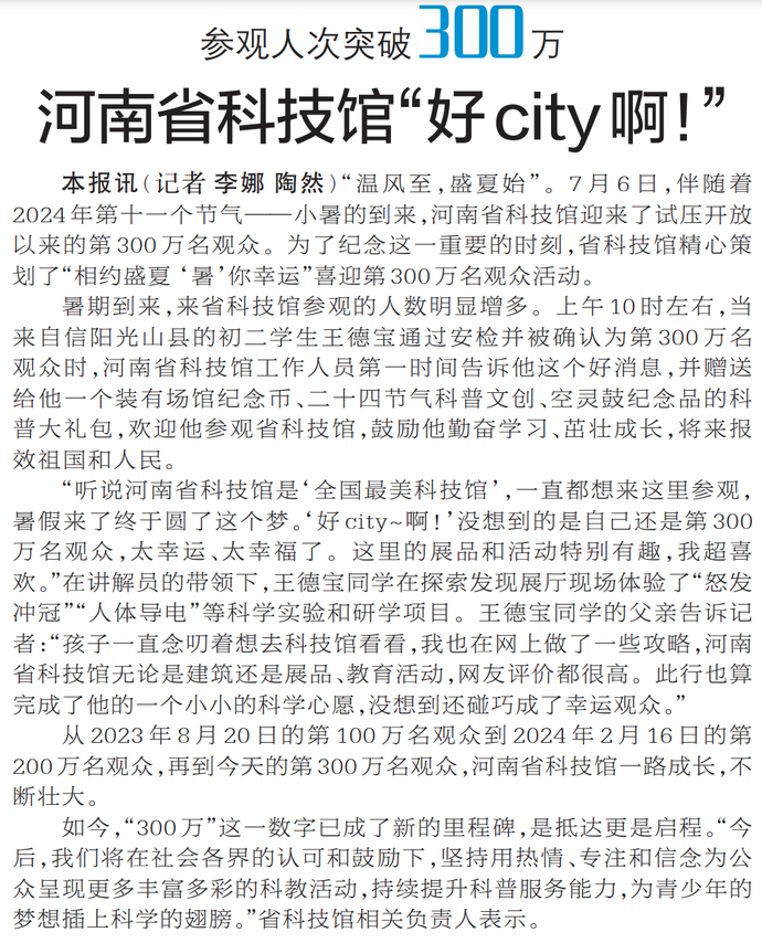 “温风至,盛夏始”。7月6日,伴随着2024年第十一个节气——小暑的到来,河南省科技馆迎来了试压开放以来的第300万名观众。为了纪念这一重要的时刻,省科技馆精心策划了“相约盛夏 ‘暑’你幸运”喜迎第300万名观众活动。(今日《郑州日报》1版)
