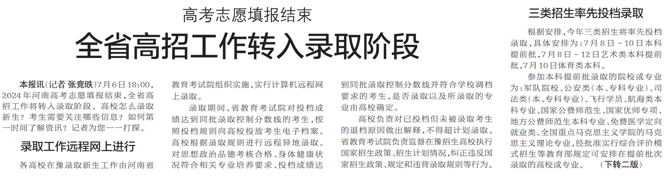 7月6日18:00,2024年河南高考志愿填报结束,全省高招工作将转入录取阶段。高校怎么录取新生?考生需要关注哪些信息?如何第一时间了解资讯?记者为您一一打探。(今日《郑州日报》1版、2版)