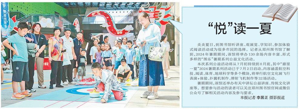炎炎夏日,到图书馆听讲座、观展览、学知识、参加体验式阅读活动成为很多市民的选择。记者从郑州图书馆了解到,2024年暑期期间,该馆将举办130余场内容丰富、形式多样的“图乐”暑期系列公益文化活动。(今日《郑州日报》1版)