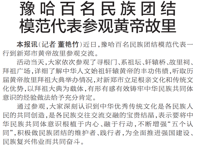 近日,豫哈百名民族团结模范代表一行到新郑市黄帝故里参观交流。(今日《郑州日报》2版)