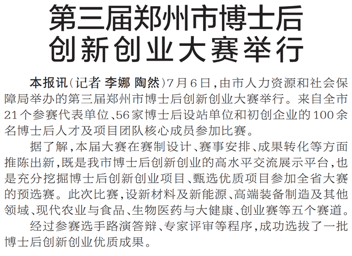 7月6日,由市人力资源和社会保障局举办的第三届郑州市博士后创新创业大赛举行。来自全市21个参赛代表单位、56家博士后设站单位和初创企业的100余名博士后人才及项目团队核心成员参加比赛。(今日《郑州日报》2版)