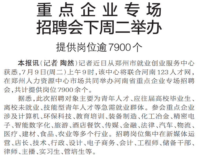 记者近日从郑州市就业创业服务中心获悉,7月9日(周二)上午9时,该中心将联合河南123人才网,在郑州人力资源中心市场共同举办河南省重点企业专场招聘会,共计提供岗位7900余个。(今日《郑州日报》2版)