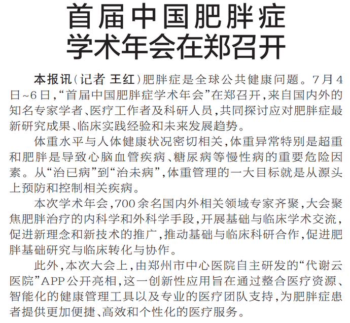肥胖症是全球公共健康问题。7月4日~6日,“首届中国肥胖症学术年会”在郑召开,来自国内外的知名专家学者、医疗工作者及科研人员,共同探讨应对肥胖症最新研究成果、临床实践经验和未来发展趋势。(今日《郑州日报》2版)