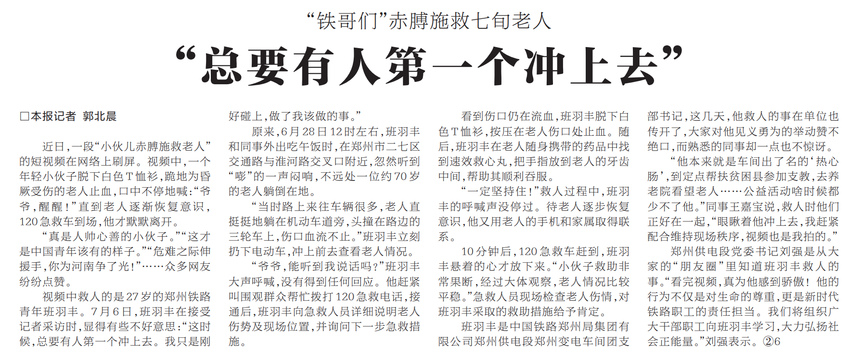 近日,一段“小伙儿赤膊施救老人”的短视频在网络上刷屏。视频中,一个年轻小伙子脱下白色T恤衫,跪地为昏厥受伤的老人止血,口中不停地喊:“爷爷,醒醒!”直到老人逐渐恢复意识,120急救车到场,他才默默离开。(今日《河南日报》1版)