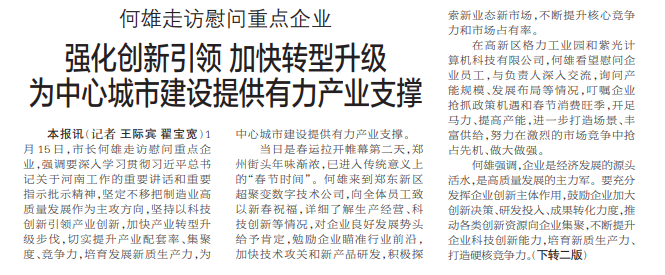 1月15日,市长何雄走访慰问重点企业,强调要深入学习贯彻习近平总书记关于河南工作的重要讲话和重要指示批示精神,坚定不移把制造业高质量发展作为主攻方向,坚持以科技创新引领产业创新,加快产业转型升级步伐,切实提升产业配套率、集聚度、竞争力,培育发展新质生产力,为中心城市建设提供有力产业支撑。(今日《郑州日报》1版、2版)