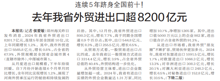 郑州海关昨日发布消息,2024年我省外贸进出口8201.7亿元,连续5年居全国前10位,比上年同期增长1.2%。其中,我市外贸进出口5565.8亿元,增长0.8%,占全省的67.9%,外贸规模居全国省会城市第4(直辖市除外)、中部城市第1。(今日《郑州日报》1版、2版)