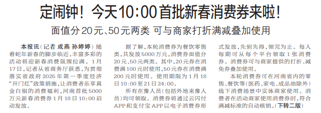 随着蛇年新春的脚步临近,丰富多彩的活动将迎新春消费氛围拉满。1月17日,记者从省商务厅获悉,为贯彻落实省政府2025年第一季度经济“开门红”政策措施,让消费者乐享真金白银的消费福利,河南首批5000万元新春消费券1月18日10:00启动发放。(今日《郑州日报》1版、2版)