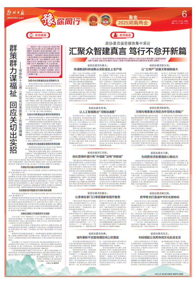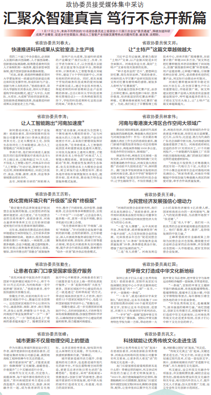 1月17日上午,来自不同界别的10名政协委员走上省政协十三届三次会议“委员通道”,围绕加速科研成果产业蝶变、促进乡村全面振兴、推动人工智能产业创新发展等热点问题传民意、献良策、谈期盼。(今日《郑州日报》6版)
