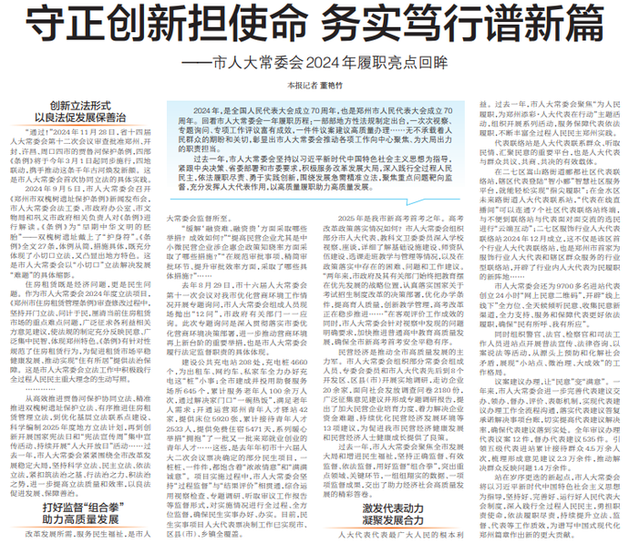 2024年,是全国人民代表大会成立70周年,也是郑州市人民代表大会成立70周年。回看市人大常委会一年履职历程:一部部地方性法规制定出台,一次次视察、专题询问、专项工作评议富有成效,一件件议案建议高质量办理……无不承载着人民群众的期盼和关切,彰显出市人大常委会推动各项工作向中心聚焦、为大局出力的职责担当。(今日《郑州日报》2版)