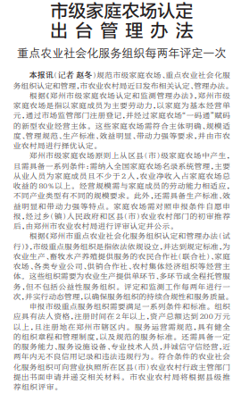 规范市级家庭农场、重点农业社会化服务组织认定和管理,市农业农村局近日发布相关认定、管理办法。(今日《郑州日报》2版)