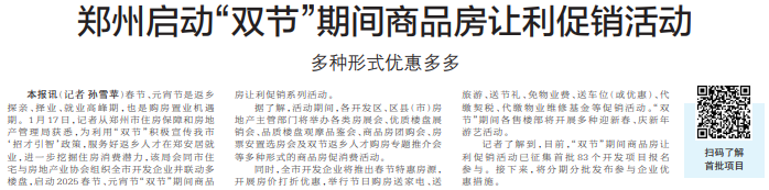 春节、元宵节是返乡探亲、择业、就业高峰期,也是购房置业机遇期。1月17日,记者从郑州市住房保障和房地产管理局获悉,为利用“双节”积极宣传我市‘招才引智’政策,服务好返乡人才在郑安居就业,进一步挖掘住房消费潜力,该局会同市住宅与房地产业协会组织全市开发企业并联动多楼盘,启动2025春节、元宵节“双节”期间商品房让利促销系列活动。(今日《郑州日报》2版)