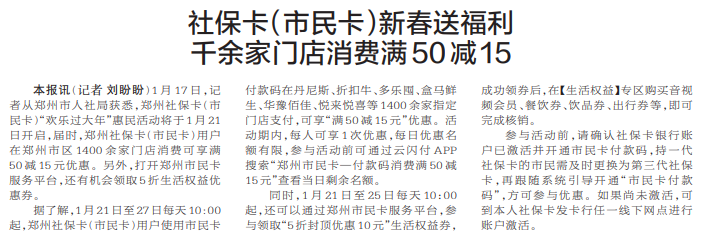 1月17日,记者从郑州市人社局获悉,郑州社保卡(市民卡)“欢乐过大年”惠民活动将于1月21日开启,届时,郑州社保卡(市民卡)用户在郑州市区1400余家门店消费可享满50减15元优惠。另外,打开郑州市民卡服务平台,还有机会领取5折生活权益优惠券。(今日《郑州日报》2版)
