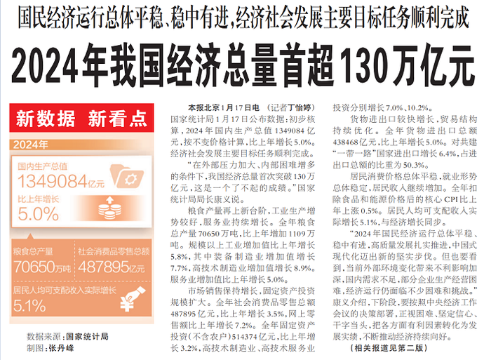国家统计局1月17日公布数据:初步核算,2024年国内生产总值1349084亿元,按不变价格计算,比上年增长5.0%。经济社会发展主要目标任务顺利完成。(今日《人民日报》1版、2版)