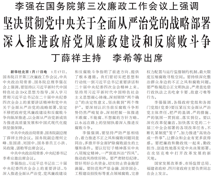 1月17日,国务院召开第三次廉政工作会议,中共中央政治局常委、国务院总理李强在会上强调,要坚持以习近平新时代中国特色社会主义思想为指导,深入学习贯彻习近平总书记在二十届中央纪委四次全会上的重要讲话精神和党中央关于全面从严治党的战略部署,坚定不移把政府党风廉政建设和反腐败斗争向纵深推进,以全面从严治党新成效为推进高质量发展和中国式现代化提供坚强保障。(今日《人民日报》1版)