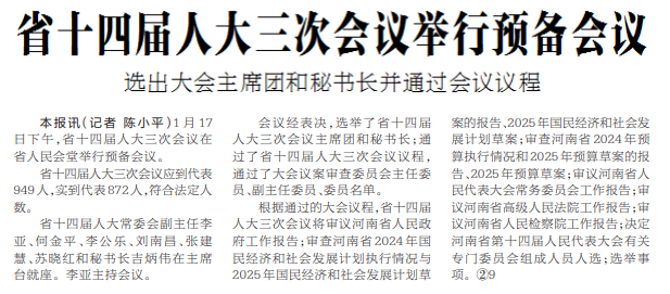 1月17日下午,省十四届人大三次会议在省人民会堂举行预备会议。(今日《河南日报》1版)