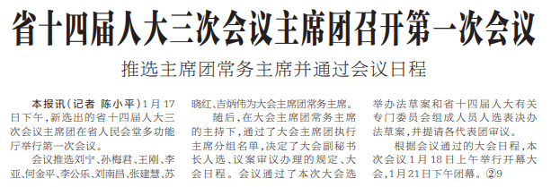 1月17日下午,新选出的省十四届人大三次会议主席团在省人民会堂多功能厅举行第一次会议。(今日《河南日报》1版)