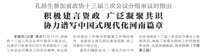 1月17日,省政协十三届三次会议举行委员小组会议,认真学习省委书记刘宁在省政协十三届三次会议开幕会上的讲话精神,审议政协常委会工作报告和提案工作情况报告。省政协主席孔昌生参加民盟、农工党委员小组讨论。(今日《河南日报》1版、3版)