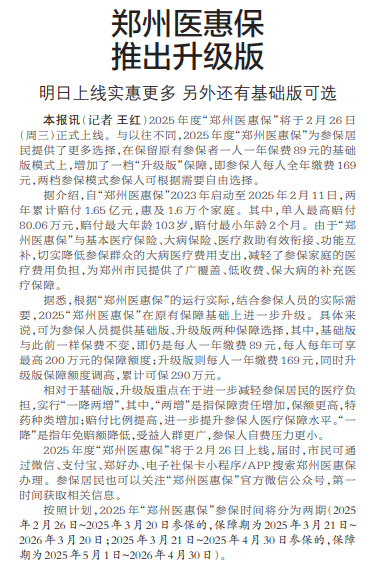 2025年度“郑州医惠保”将于2月26日(周三)正式上线。与以往不同,2025年度“郑州医惠保”为参保居民提供了更多选择,在保留原有参保者一人一年保费89元的基础版模式上,增加了一档“升级版”保障,即参保人每人全年缴费169元,两档参保模式参保人可根据需要自由选择。(今日《郑州日报》1版)