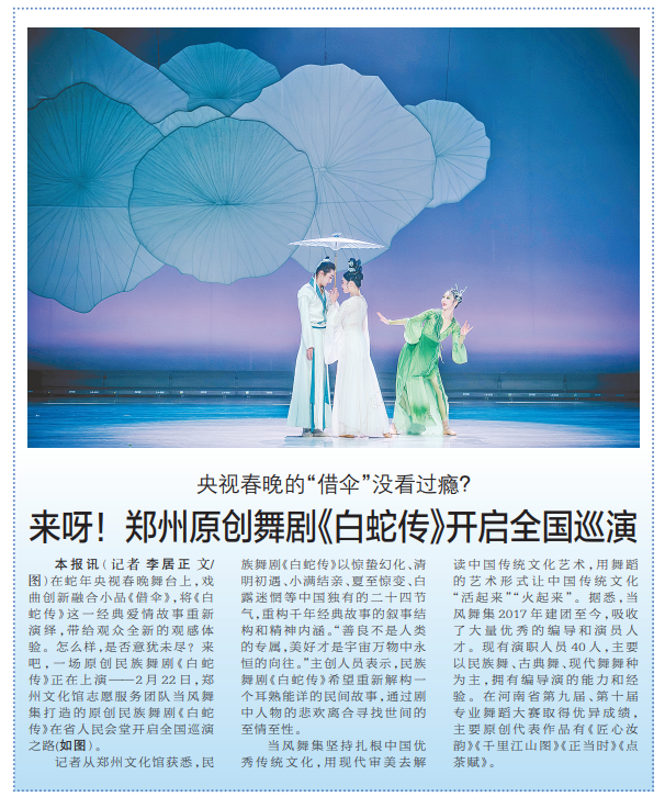 在蛇年央视春晚舞台上,戏曲创新融合小品《借伞》,将《白蛇传》这一经典爱情故事重新演绎,带给观众全新的观感体验。怎么样,是否意犹未尽?来吧,一场原创民族舞剧《白蛇传》正在上演——2月22日,郑州文化馆志愿服务团队当风舞集打造的原创民族舞剧《白蛇传》在省人民会堂开启全国巡演之路。(今日《郑州日报》1版)