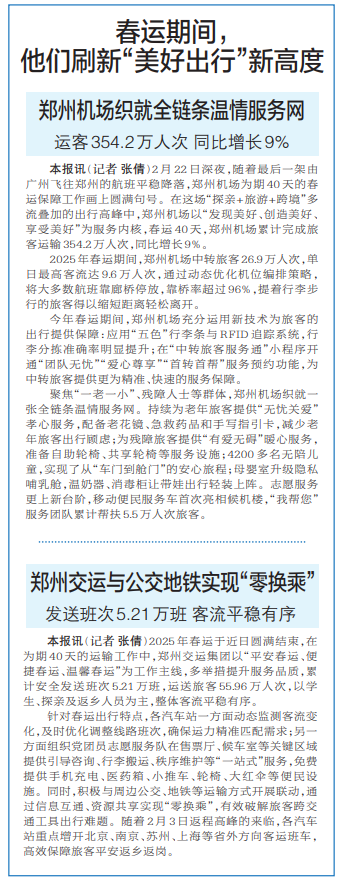 2月22日深夜,随着最后一架由广州飞往郑州的航班平稳降落,郑州机场为期40天的春运保障工作画上圆满句号。在这场“探亲+旅游+跨境”多流叠加的出行高峰中,郑州机场以“发现美好、创造美好、享受美好”为服务内核,春运40天,郑州机场累计完成旅客运输354.2万人次,同比增长9%。(今日《郑州日报》1版)