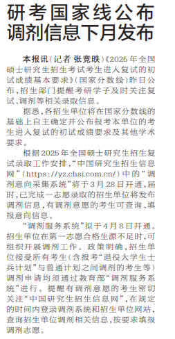《2025年全国硕士研究生招生考试考生进入复试的初试成绩基本要求》(国家分数线)昨日公布,招生部门提醒考研学子及时关注复试、调剂等相关录取信息。(今日《郑州日报》2版)