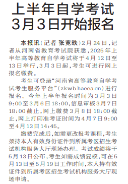 2月24日,记者从河南省教育考试院获悉,2025年上半年高等教育自学考试将于4月12日至13日举行,3月3日起,考生可进行网上报名缴费。(今日《郑州日报》2版)