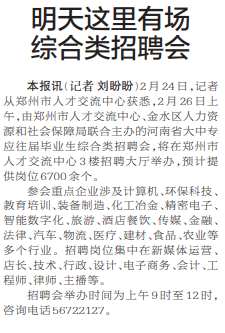 2月24日,记者从郑州市人才交流中心获悉,2月26日上午,由郑州市人才交流中心、金水区人力资源和社会保障局联合主办的河南省大中专应往届毕业生综合类招聘会,将在郑州市人才交流中心3楼招聘大厅举办,预计提供岗位6700余个。(今日《郑州日报》2版)