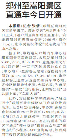 郑州至嵩阳景区直通车来了。郑州交运“站点巴士”今日正式开通郑州至嵩阳景区直通车。该线路限时优惠票价仅需19.99元(原价30元),让市民轻松体验“说走就走”的山水之旅。(今日《郑州日报》2版)