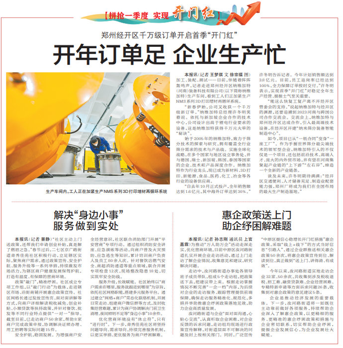 加工、装配、测试……日前,伴随着阵阵轰鸣声,记者走进郑州经开区纳维加特(河南)装备科技有限公司生产车间,看到工人们正加紧生产NMS系列3D打印增材再循环系统。(今日《郑州日报》7版)