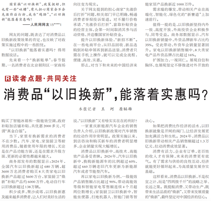 网友的问题,既表达了对消费品以旧换新政策效果的肯定,也反映了对政策实施过程中的一些担忧。
