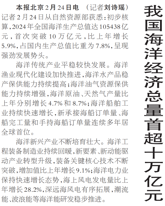 记者2月24日从自然资源部获悉:初步核算,2024年全国海洋生产总值达105438亿元,首次突破10万亿元,比上年增长5.9%,占国内生产总值比重为7.8%,呈现强劲发展势头。(今日《人民日报》1版)