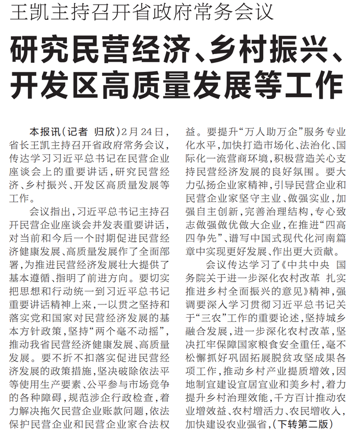 2月24日,省长王凯主持召开省政府常务会议,传达学习习近平总书记在民营企业座谈会上的重要讲话,研究民营经济、乡村振兴、开发区高质量发展等工作。(今日《河南日报》1版、2版)