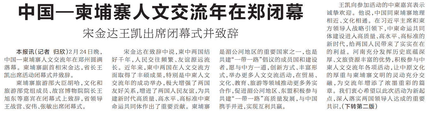 2月24日晚,中国—柬埔寨人文交流年在郑州圆满落幕。柬埔寨副首相宋金达,省长王凯出席活动闭幕式并致辞。(今日《河南日报》1版、2版)