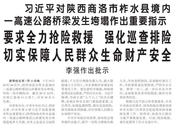 习近平对陕西商洛市柞水县境内一高速公路桥梁发生垮塌作出重要指示