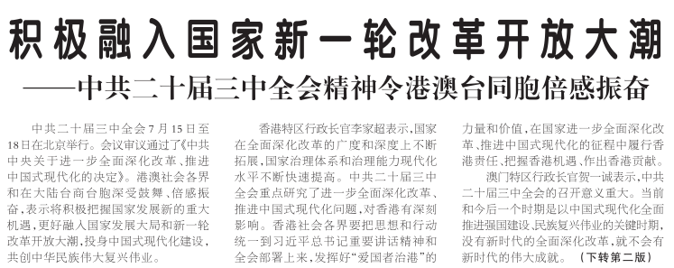 中共二十届三中全会7月15日至18日在北京举行。会议审议通过了《中共中央关于进一步全面深化改革、推进中国式现代化的决定》。港澳社会各界和在大陆台商台胞深受鼓舞、倍感振奋,表示将积极把握国家发展新的重大机遇,更好融入国家发展大局和新一轮改革开放大潮,投身中国式现代化建设,共创中华民族伟大复兴伟业。(今日《人民日报》1版、2版)