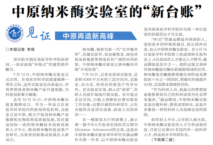 7月12日,中原纳米酶实验室正式启用。在省医学科学院重建揭牌一周年之际,这所实验室迈向新起点,并将带领我省纳米酶产业开道领跑,为科技创新聚力赋能。(今日《河南日报》1版、2版)