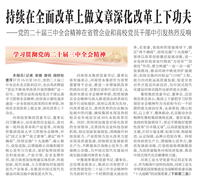 7月15日至18日,党的二十届三中全会在北京胜利召开,全会再次释放“坚定不移高举改革开放的旗帜”这一信号。省管企业和高校党员干部认真学习贯彻全会精神,纷纷表示要吃透弄通进一步全面深化改革的任务举措,持续在全面改革上做文章、深化改革上下功夫。(今日《河南日报》1版、2版)