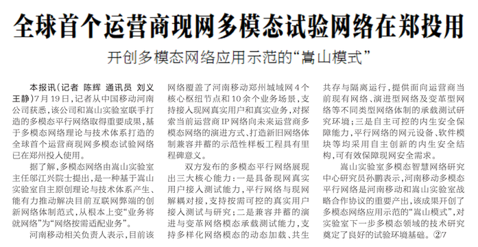 7月19日,记者从中国移动河南公司获悉,该公司和嵩山实验室联手打造的多模态平行网络取得重要成果,基于多模态网络理论与技术体系打造的全球首个运营商现网多模态试验网络已在郑州投入使用。(今日《河南日报》1版)
