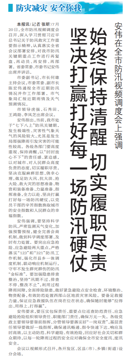7月20日,全市防汛视频调度会召开,深入学习贯彻习近平总书记关于防汛救灾工作重要指示精神,认真落实全省会议部署安排,对我市防汛关键期重点工作进行再复盘、再动员、再安排、再部署。省委常委、市委书记安伟出席并讲话。