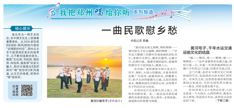在郑州这片历史悠久的土地上,同样有民歌传承。走,一起去追寻那些遗落的余韵和痕迹,用心聆听,全情体验,感受群众的智慧与情感。(今日《郑州日报》1版、2版)