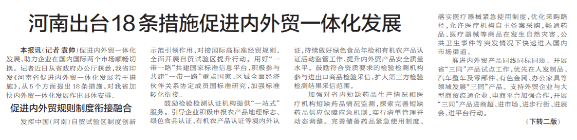 促进内外贸一体化发展,助力企业在国内国际两个市场顺畅切换。记者近日从省政府办公厅获悉,我省印发《河南省促进内外贸一体化发展若干措施》,从5个方面提出18条措施,对我省加快内外贸一体化发展作出具体安排。(今日《郑州日报》1版、2版)