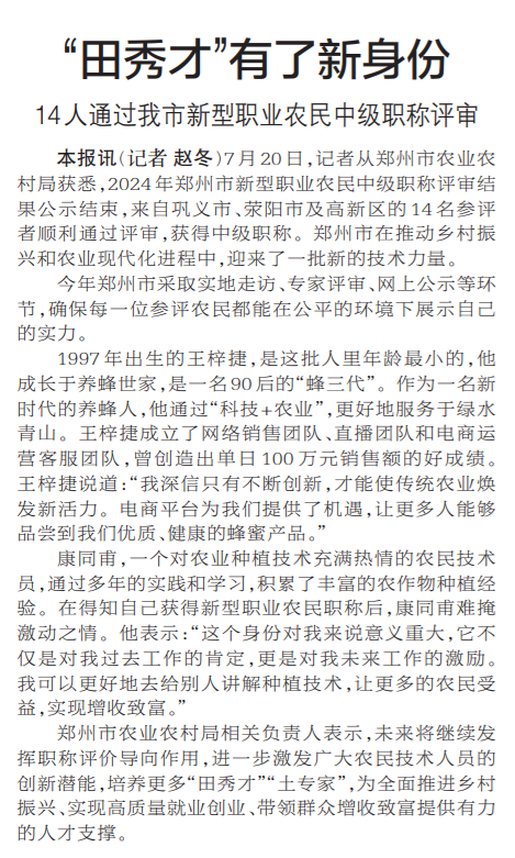 7月20日,记者从郑州市农业农村局获悉,2024年郑州市新型职业农民中级职称评审结果公示结束,来自巩义市、荥阳市及高新区的14名参评者顺利通过评审,获得中级职称。郑州市在推动乡村振兴和农业现代化进程中,迎来了一批新的技术力量。(今日《郑州日报》2版)