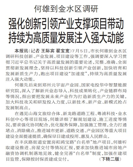 7月5日,市长何雄到金水区调研科技创新、产业发展、项目建设等工作,强调要深入学习贯彻习近平总书记关于高质量发展的重要论述,完整、准确、全面贯彻新发展理念,坚持以科技创新引领产业创新,加快培育和发展新质生产力,跑出项目建设“加速度”,持续为高质量发展注入强大动能。(今日《郑州日报》1版、2版)